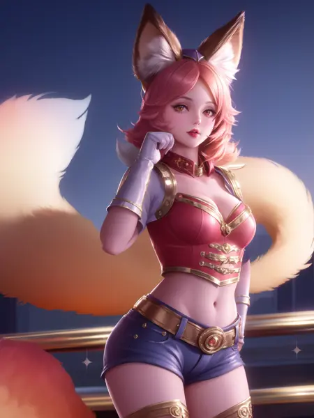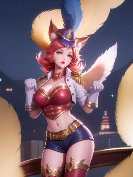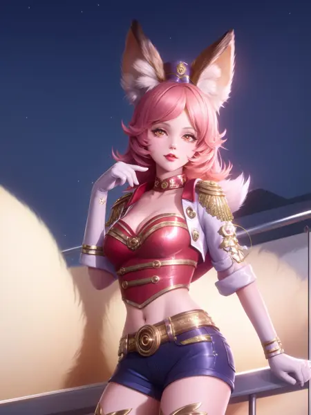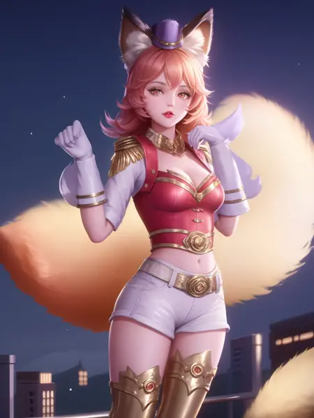 - WZRYdajiMLWJS, 1girl, solo, breasts, fox tail, fox ears, hat, white gloves, belt, orange eyes, orange hair, epaulettes, thigh boots, heart, short shorts, parted lips, looking at viewer, hat feather, jewelry,red lips, curly hair, lipstick, bangs, choker, short sleeves, mini hat, lips, buckle, makeup, short hair,cropped jacket,crop top, cityscape, night, mature female, poolside, sitting,
