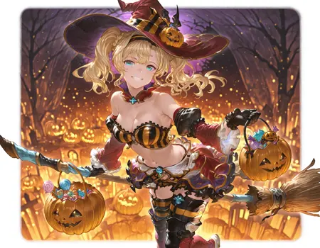 zetahallo, twintails, witch hat, halloween costume, striped bra, detached collar, black gloves, midriff, navel, detached sleeves, bare shoulders,