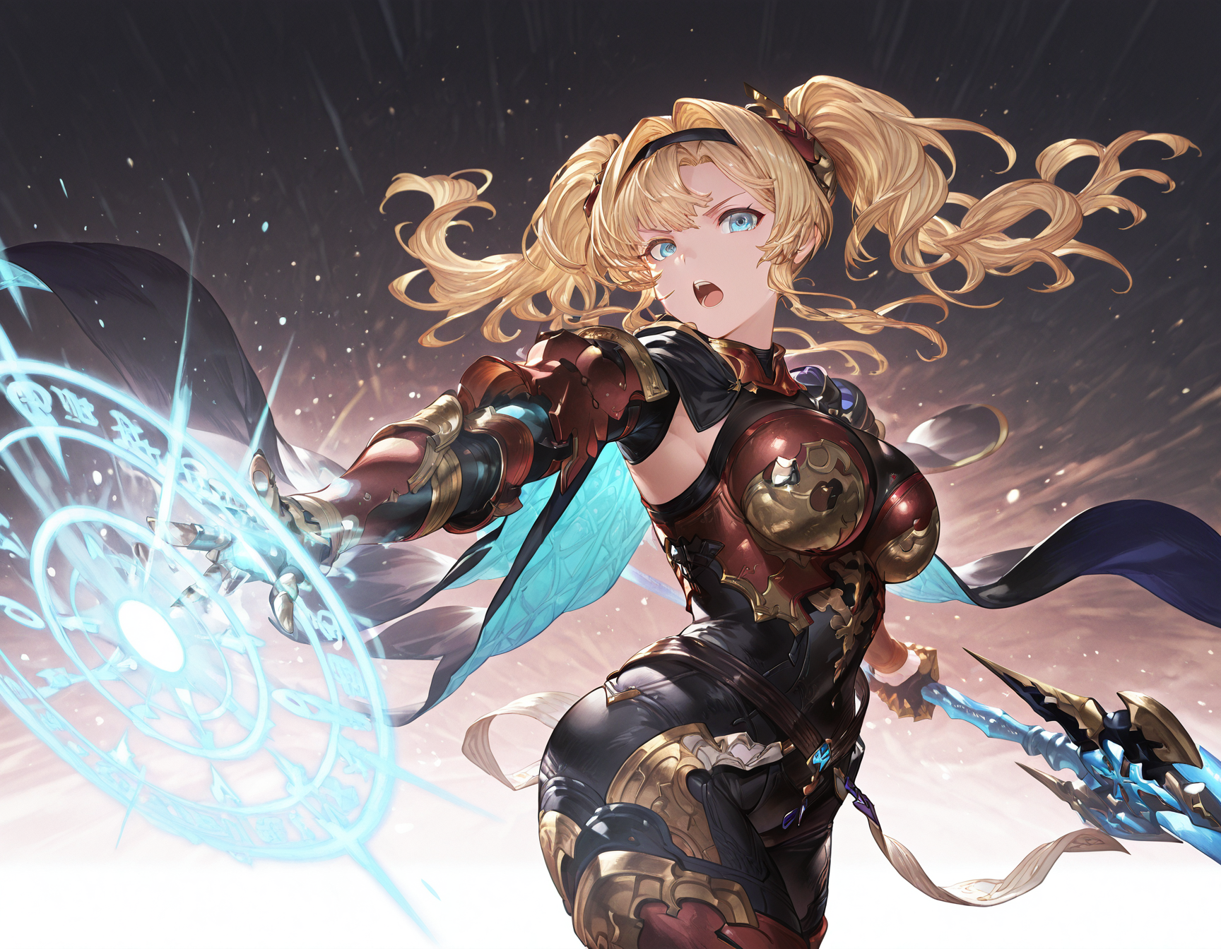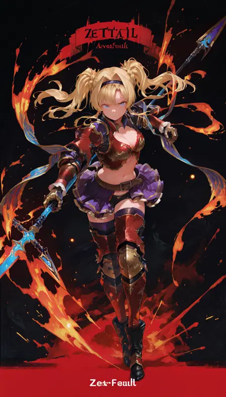 zetadefault, twintails, red armor, gauntlets, purple skirt, belt, midriff, navel,