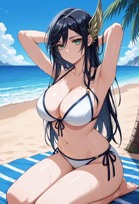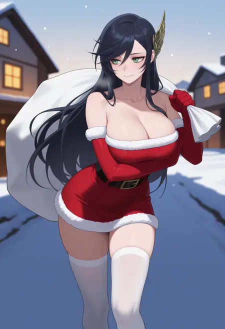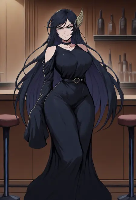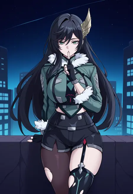 트리거 + 외모: brnhld, 긴 머리, 검은 머리, 날개 모양 머리 장식, 녹색 눈, 큰 가슴