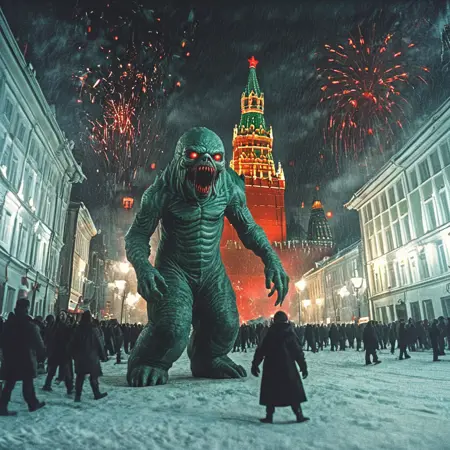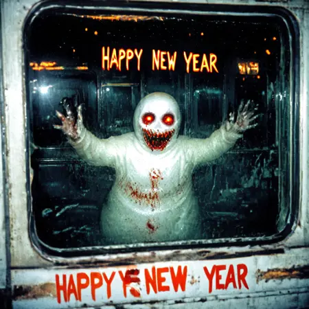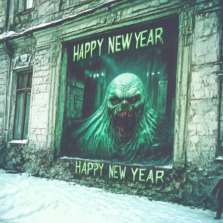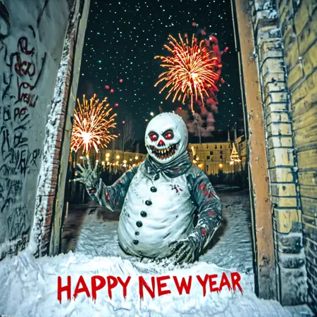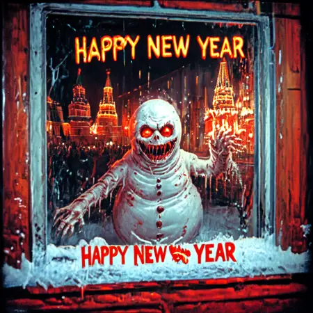 crasno , "happy new year" , snowman , snow , teeth , horror (theme) , solo , window , open mouth , bottle , no humans , monster , red square , outdoors , building , blood , fireworks , zombie , night , looking at viewer , red eyes , outstretched arms , hat , smile , snowing , happy new year , inside , skeleton , arms up , waving , holding , chromatic aberration , arm up , stone building , street , neon text , horror , (theme) , lantern , brick building , christmas lights , night sky , lamppost , sharp teeth , indoors , christmas , city , door , dutch angle , glowing , glowing eyes , balloon , crowd , sky , tree , male focus , skull , doorway , christmas decorations , scarf , reaching , top hat , holding balloon , celebration , alley , wooden floor , holding up arms , red suit , wooden walls , fence , wooden building , scenery , store front , white headwear , winter , grin , graffiti , sitting , arms at sides , fog , red light , 2others , food , table , painting (object) , saturated , carrot , letterboxed , ghost , painting , hallway , english text , hood , abandoned building , reaching out , gloves , scary eyes , porch , box , crown , white eyes , godzilla , happy , anticipation , hands up , angry , broken window , reflection , black eyes , glass , christmas tree , bare tree , pajamas , tuxedo , bowtie , road , apartment , filth , tongue , wooden house , santa hat , white beard