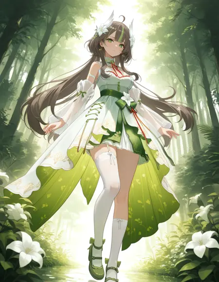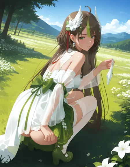 衣装を含んだプロンプト:nailv0304, socks, single sock, long hair, dress, hair ornament, green eyes, kneehighs, flower, single kneehigh, single thighhigh, detached sleeves, hair flower, green footwear, thighhighs, asymmetrical legwear, twintails, see-through sleeves, white socks, see-through, ahoge, white dress, ribbon, breasts, streaked hair, white flower, green dress, multicolored hair, low twintails, very long hair, white thighhighs, bow, virtual youtuber, uneven legwear, shoes, heart ahoge, brown hair, cleavage, detached collar, hair between eyes, neck ribbon, bridal garter, white sleeves, bare shoulders,