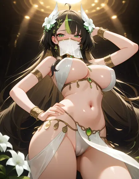 衣装を含まないプロンプト:nailv0304, long hair, hair ornament, green eyes, flower, hair flower, twintails, ahoge, white flower, multicolored hair, low twintails, very long hair, virtual youtuber, heart ahoge, brown hair, hair between eyes,