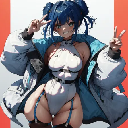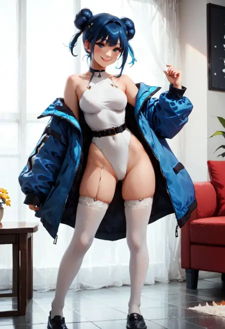 옷: 더블 둥, 레오타드, 허벅지까지 오는 양말, 노출된 어깨, 머리 둥, 파란 머리, 가슴, 덮인 배꼽, 재킷, 열린 옷, 허벅지, 하이레그 레오타드, 과대한 파란 재킷, 파란 눈