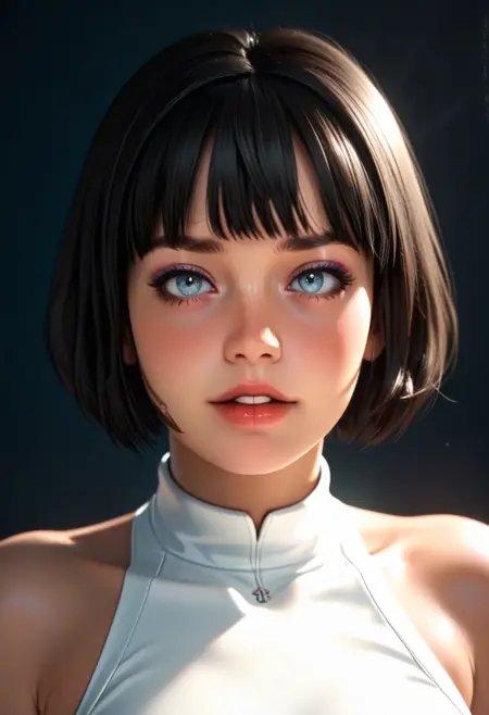 Neva, Virtuallust, female, 1girl, black hair, medium hair, bangs, bob cut, blue eyes, eye shadow, shiny skin, black choker,