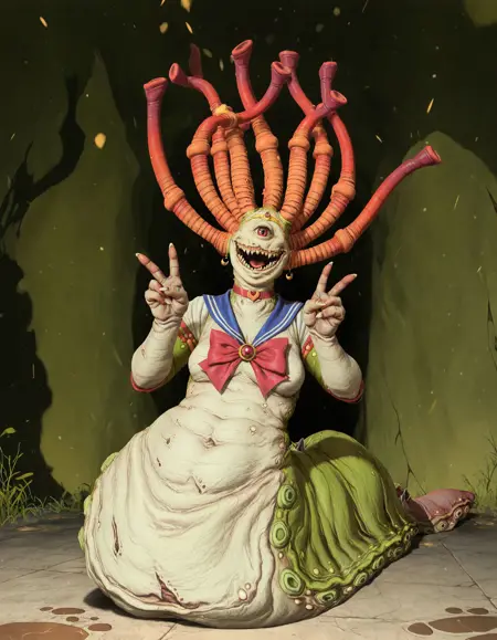 BeastOfNurgle, monster, stomach mouth, cyclops, tentacle hair, slug tail, sharp teeth,