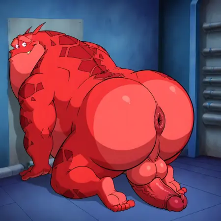 BoosterMunchapper,Alien,Red Skin,Light Red Underbelly,Dark Red Scaly patterns on his back,Black Pupils,Light Pink Sclera,Space Suit,Janitor Clothes,Janitor suit,Dark Red Scaly patterns on his arms, light yellow teeth