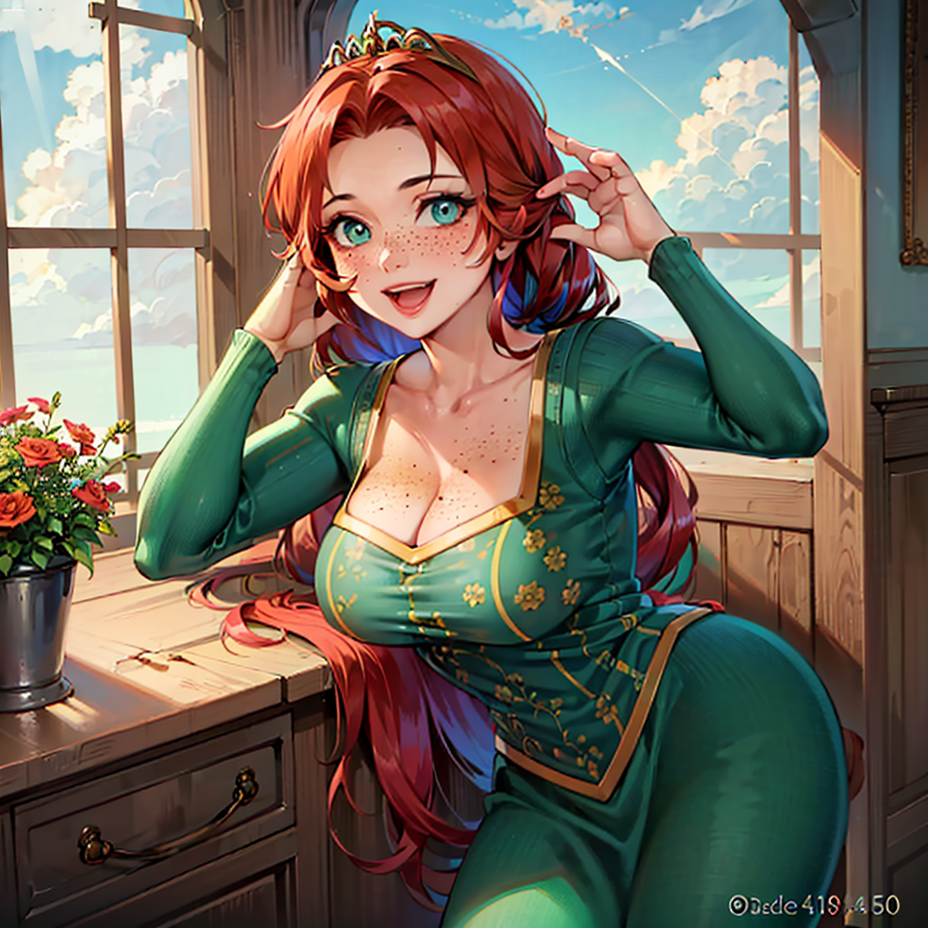 使用激活词 "FionnaXLP" "棕色头发,蓝色眼睛,单马尾,王冠,绿色连衣裙,露胸,雀斑",并添加 "Cartoon" 来增强效果。