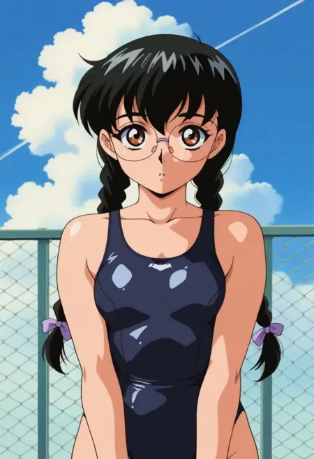 : 이즈미 유카, 안경, 검은 머리, 쌍辫, 갈색 눈