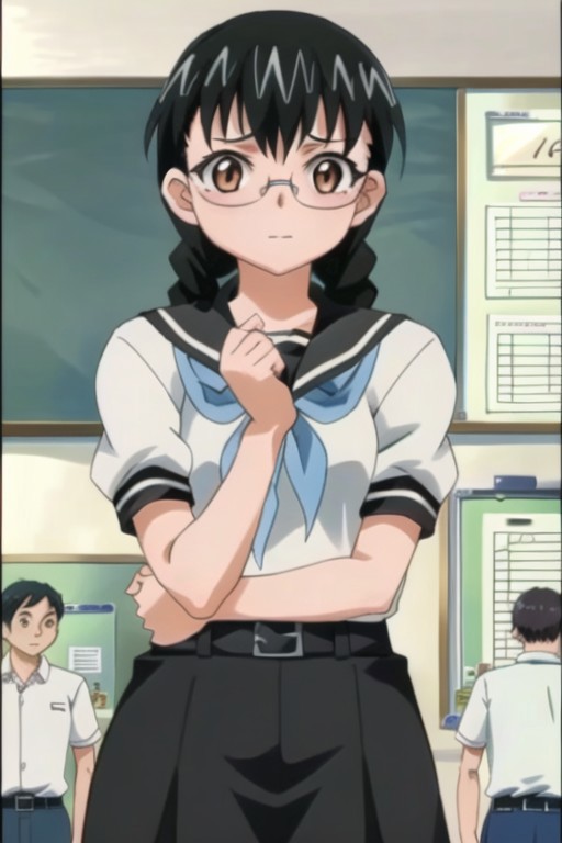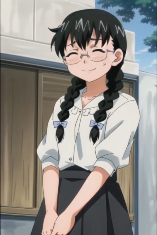 : izumi yuka, めがね, 黒髪, 双子の編み込み, 茶色の目