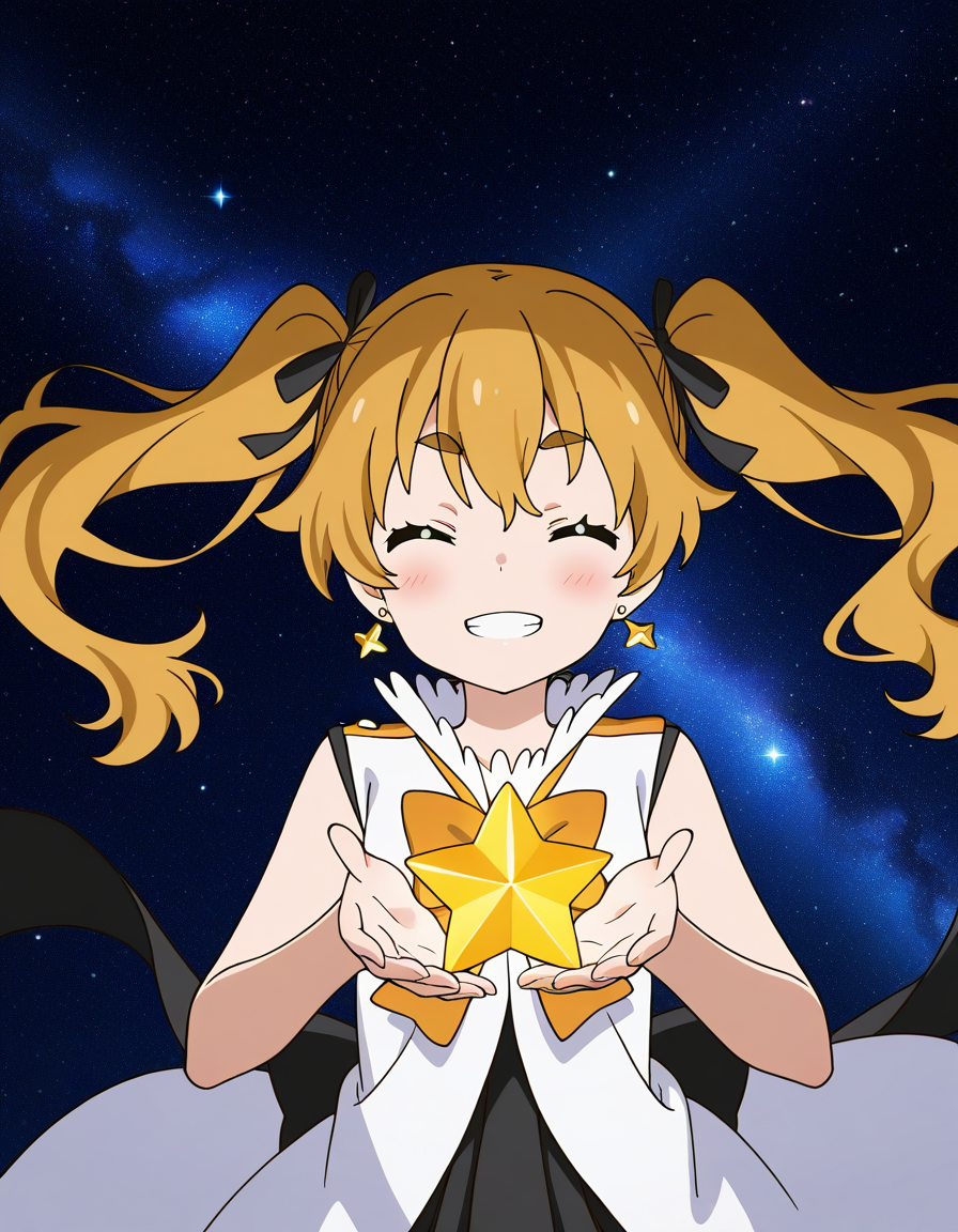 Hikaru(Pleiades), 1girl, solo, twintails, blonde hair, yellow eyes, long hair, hair ribbon, black bow, thick eyebrows, anime coloring,