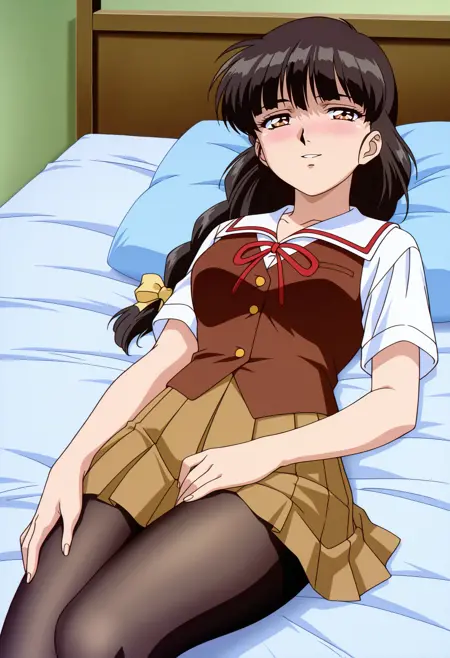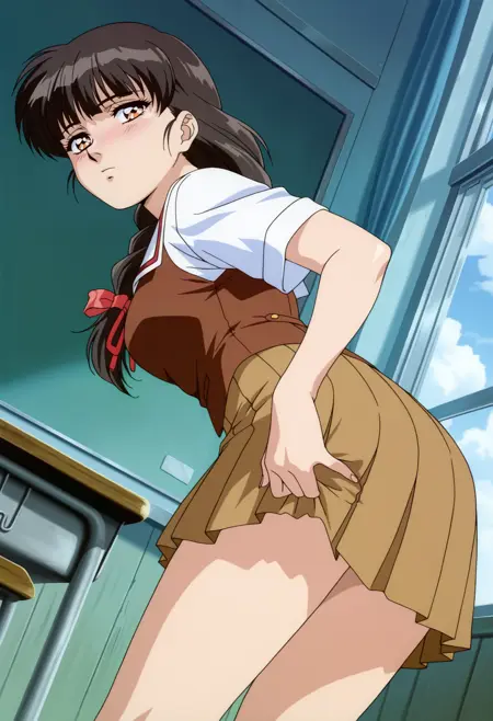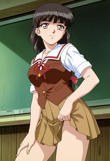 베이스: miyukiisaku, 1girl, 애니메이션 컬러링, 레트로 아트스타일, 혼자, 긴 머리, 검은 머리, 낮은 포니테일, 둔한 앞머리, 갈색 눈, isaku 학교 유니폼, 슬라이더 칼라, 빨간 조끼, 짧은 소매, 갈색 스커트, 주름 스커트, 빨간 리본, 중간 크기 가슴,
