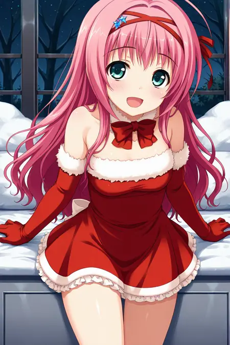 christmas, santa costume, ribbon, hair ribbon, hair bow, red ribbon, detached collar, bow, bowtie, red bow, collarbone, fur collar, fur trim, strapless, red dress, short dress, strapless dress, gloves, fur-trimmed gloves, detached sleeves, bare shoulders, elbow gloves, red gloves