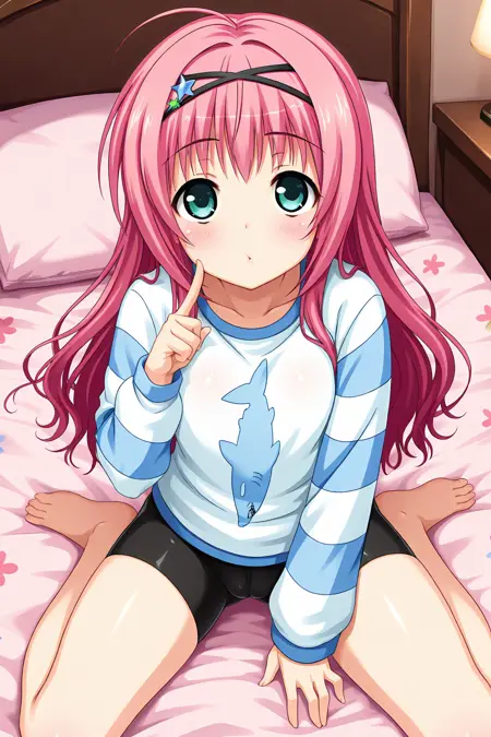 pajamas, striped, shirt, striped shirt, long sleeves, raglan sleeves, striped sleeves, collarbone, animal print, shark, fish print, bike shorts, black shorts, blue shirt