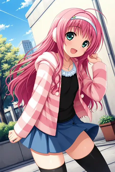 kinomoto nokia, 1girl, solo, aqua eyes, pink hair, long hair, wavy hair, hairband, black hairband, x hair ornament, hair ornament, star hair ornament, small breasts