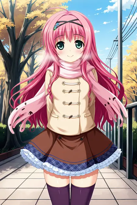 winter clothes, school uniform, scarf, pink scarf, stuffed bunny, coat, winter coat, long sleeves, buttons, plaid, skirt, brown skirt, frills, frilled skirt, plaid skirt