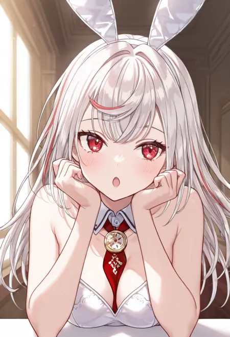 fake animal ears, bare shoulders, strapless leotard, white leotard, necktie, shoulder bag, navel cutout, heart cutout