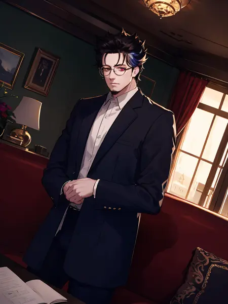 Basic: black hair,short hair,mask,one eye covered,heterochromia,red eyes,blue eyes,black suit,jacket,armor,mask,breastplate,mechainical,belt