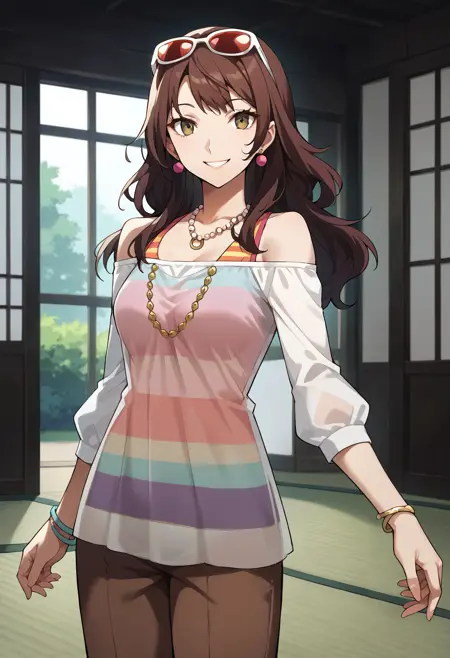 p4rise-timeskip, alternate hairstyle, hair down, eyewear on head, sunglasses, bead necklace, layered clothing, off-shoulder shirt, bare shoulders, see-through shirt, see-through, long sleeves, tank top, rainbow tank top, brown pants, capri pants, bracelet, wristband,