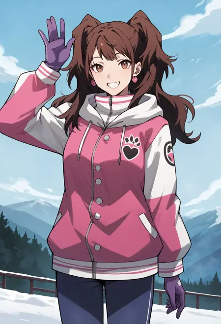 p4rise-ski, jacket, pink jacket, long sleeves, white sleeves, hood, gloves, purple gloves, pants, blue pants, heart \(symbol\),