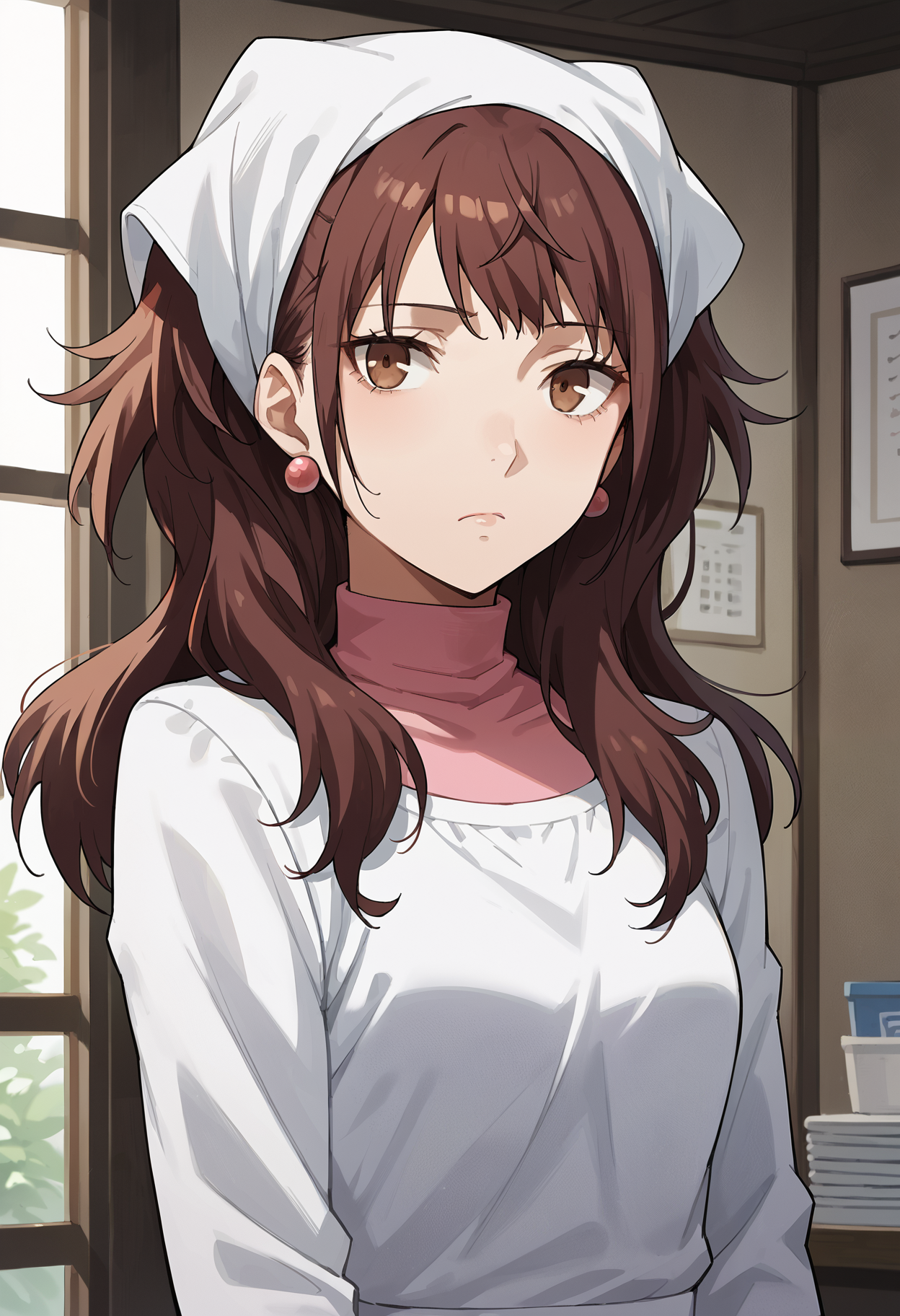 p4rise-tofu, head scarf, kappougi, turtleneck, pink turtleneck, skirt, blue skirt