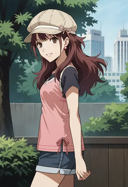 p4rise-sumcas2, alternate hairstyle, hair down, hat, casual, t-shirt, black t-shirt, tank top, pink tank top, layered shirt, shorts, blue shorts, denim shorts,