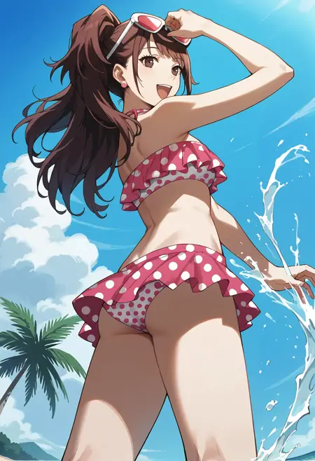 p4rise-swim2, halter bandeau bikini, bikini skirt, pink bikini, polka dot bikini, frilled bikini, eyewear on head, sunglasses, navel,