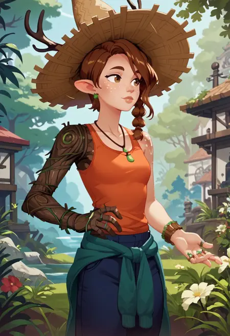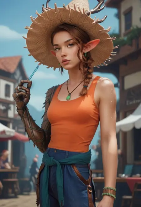 麦わら帽子、ジュエリー、腰に巻いた服、ネックレス、ブレスレット、青いズボン、シャツ、タンクトップ、茶色の頭部装備、ノースリーブ、指輪、イヤリング、