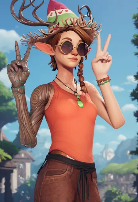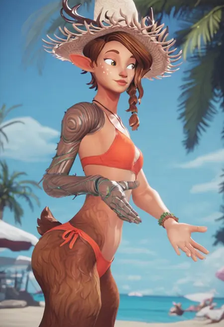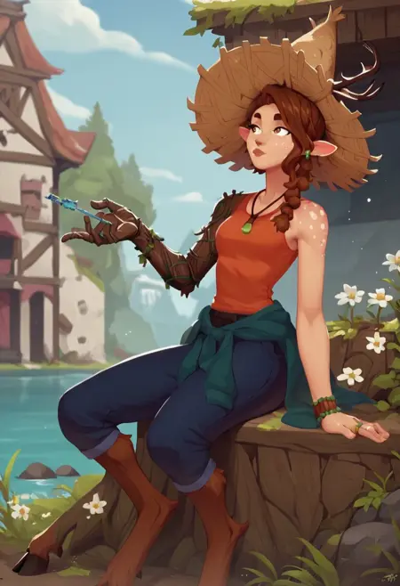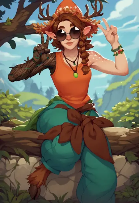 茶色の目、茶色の髪、尖った耳、編み髪、ツノ、小さな胸、義手、片方の機械式腕、鹿の耳、モンスターガール、濃い眉、唇、サティロスの足、(茶色肌の女性:1.5)