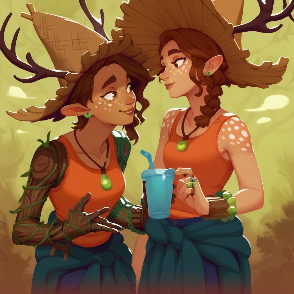 棕色眼睛,棕色头发,尖耳朵,辫子,鹿角,小胸,机械义肢,单机械臂,鹿耳,怪物娘,浓眉,嘴唇,半人马腿,(深色皮肤女性:1.5)