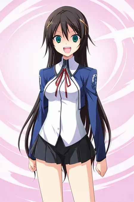 school uniform, uniform, ribbon, red ribbon, neck ribbon, jacket, blue jacket, cropped jacket, open clothes, open jacket, emblem, shirt, white shirt, collared shirt, dress shirt, wing collar, buttons, long sleeves, skirt, black skirt, pleated skirt, miniskirt