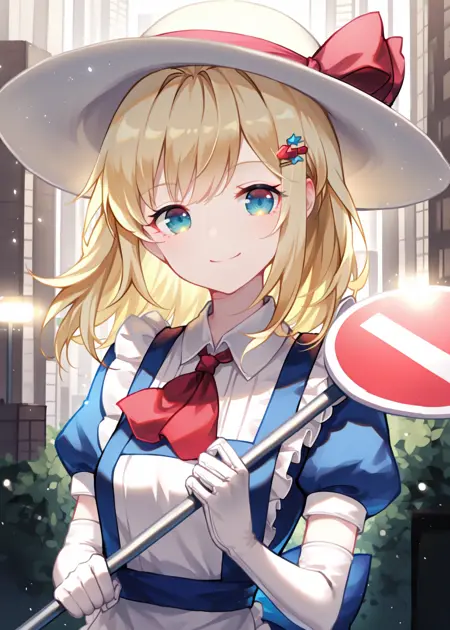 1girl, ILanaberal\(touhou\), 금발 머리, 드레스, 장갑, 앞치마, 팔꿈치 장갑, 짧은 소매, 파란 드레스, (모자)도로 표지판을 든 경우
