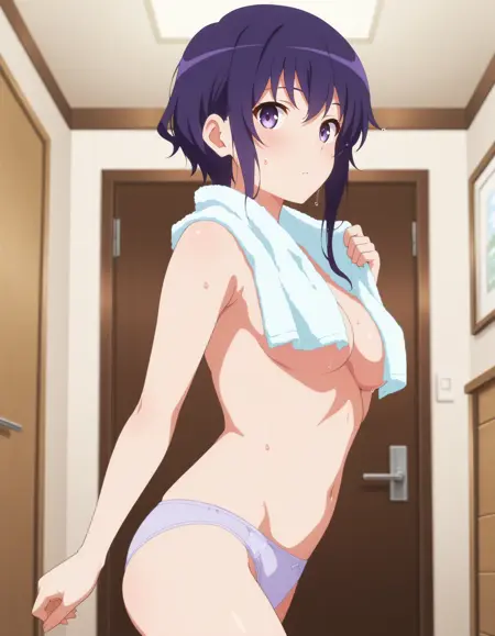 1소녀, Michiru lora:IL-Michiru:1, 보라색 머리, 단발, 보라색 눈, 측면 머리카락, 중간 사이즈 가슴