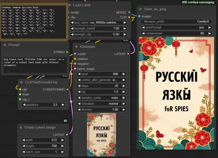 ワークフロー:https://github.com/Mozer/comfy_stuff/blob/main/workflows/flux_rus_lora_100k.json