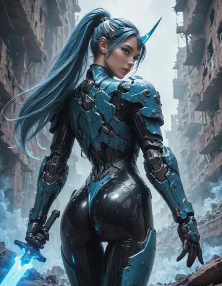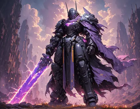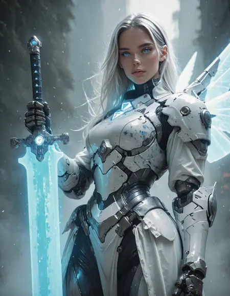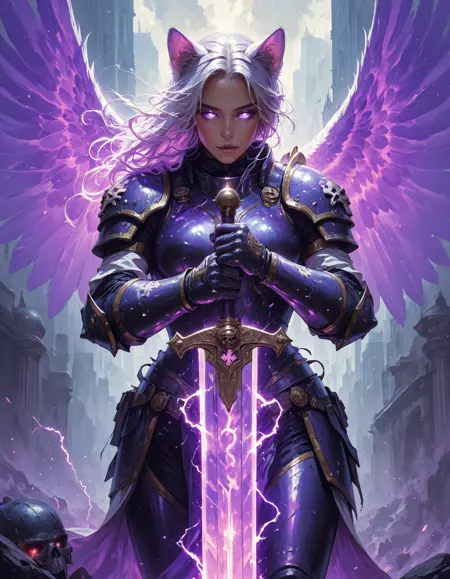 "masterpiece, best quality, amazing quality, very aesthetic, high resolution, absurdres, newest, photorealism, realistic,,dynamic close up angle, close up, cat girl, cat ears, beautiful face, glowing eyes, blue high tech warhammer 40k armor, beuatiful female face features, dynamic close up pose, blue electricity sparks, holding a giant blue glowing sword, sword is resting on the ground, holofoil glitter, faint, glowing, ethereal wings, hair flowing in wind, long hair, otherworldly glow, magical temple in background, hkstyle"