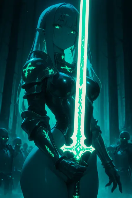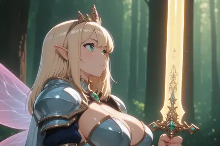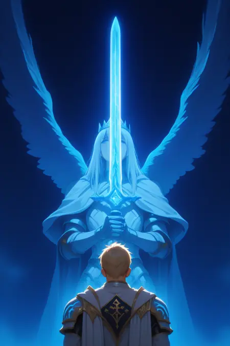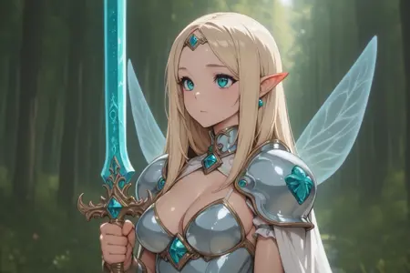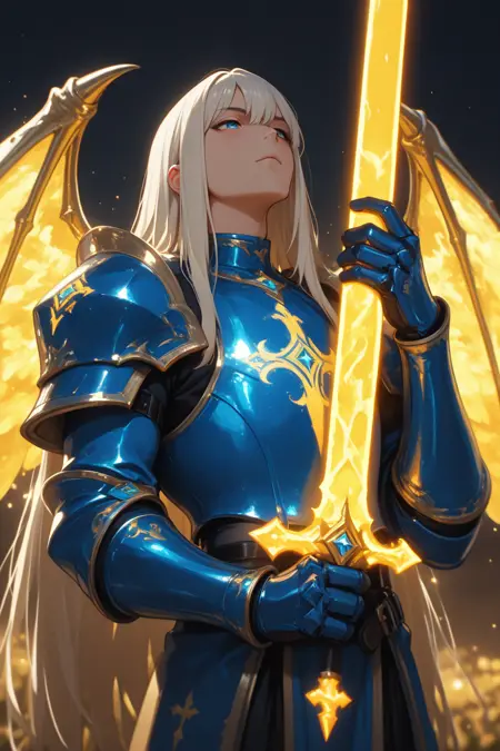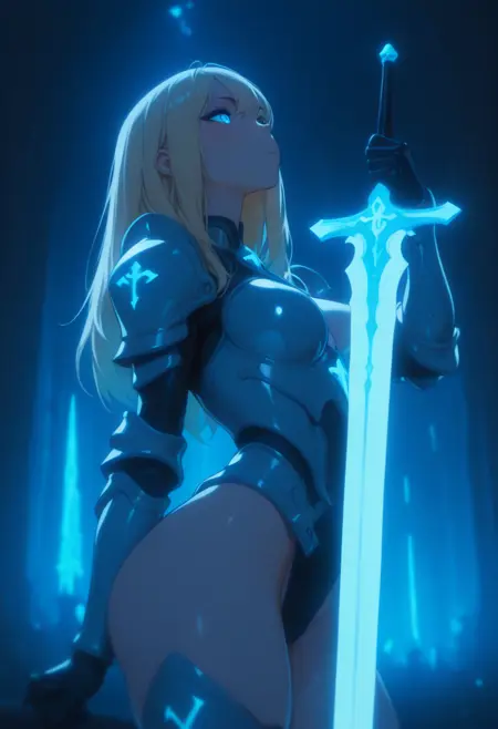 "masterpiece, best quality, amazing quality, very aesthetic, high resolution, absurdres, newest, photorealism, realistic,,dynamic close up angle, close up, cat girl, cat ears, beautiful face, glowing eyes, blue high tech warhammer 40k armor, beuatiful female face features, dynamic close up pose, blue electricity sparks, holding a giant blue glowing sword, sword is resting on the ground, holofoil glitter, faint, glowing, ethereal wings, hair flowing in wind, long hair, otherworldly glow, magical temple in background, hkstyle"