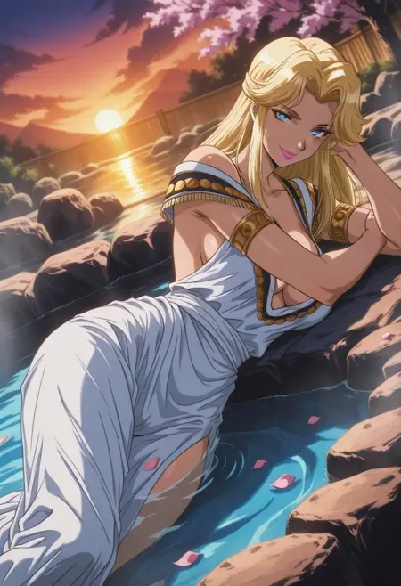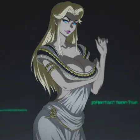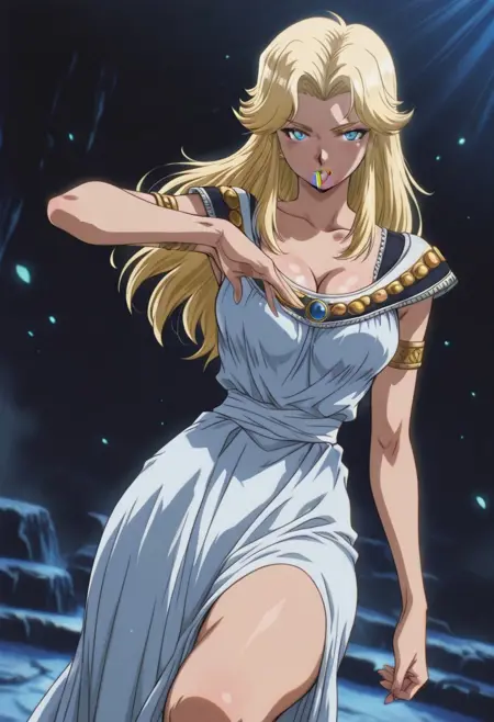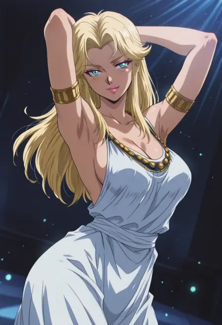 FatimavonVinlandTF, 1girl, solo, blonde hair, long hair, blue eyes, blonde eyebrows, lips, lipstick, makeup, cleavage, large breast, long dress, dress ornament, collarbone, sash, armlet, backless dress, white dress,