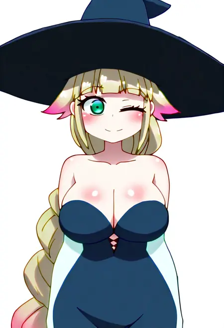 Witch - 1girl, solo, smile, looking at viewer, long hair, breasts, looking at viewer, blush, smile, bangs, blue eyes, blonde hair, large breasts, simple background, gloves, hat, white background, dress, cleavage, bare shoulders, very long hair, pink hair, braid, multicolored hair, one eye closed, elbow gloves, white gloves, blunt bangs, large breasts, aqua eyes, single braid, witch hat, blue dress, blue headwear, witch,