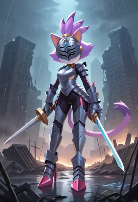 Sir Percival, Knight, purple skin, gray helmet, knight armor, iron armor, gray metal gloves, dark pink heels, blue gem in forehead, cat tail, cat ears, holding sword, Sword
