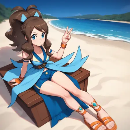 | Trained Words | syghilda, blue eyes, brown hair, sidelocks, high ponytail, antenna hair, sleeveless dress, showgirl skirt, multicolored dress, beige dress, blue dress, v-neck, bridal gauntlets, bracelet, blue shorts, short shorts, sandals, orange footwearCopied! |