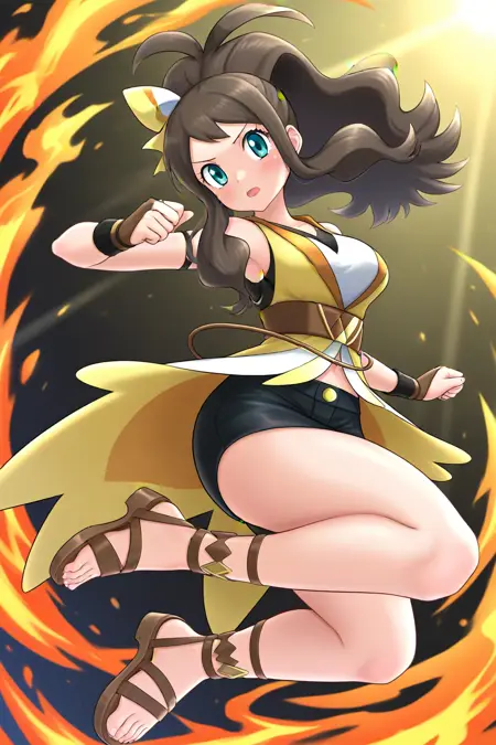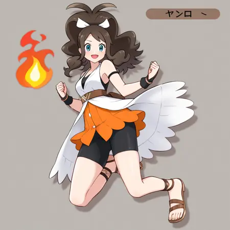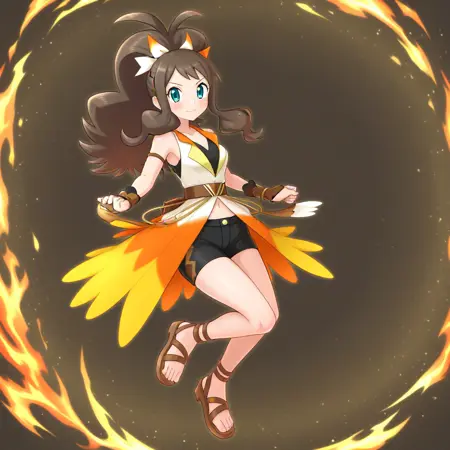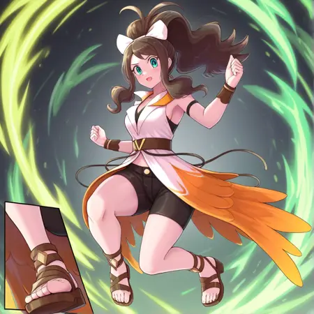 syghilda, blue_eyes, brown_hair, high_ponytail, bangs, white_hair_ribbon, sleeveless, long_dress, official_alternate_costume, belt, bike_shorts, white_dress, black_shorts, knees, sandals, toes