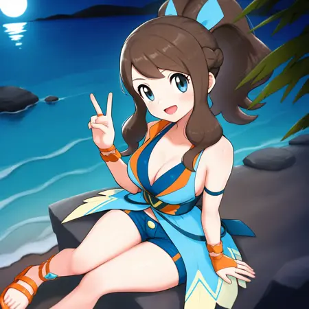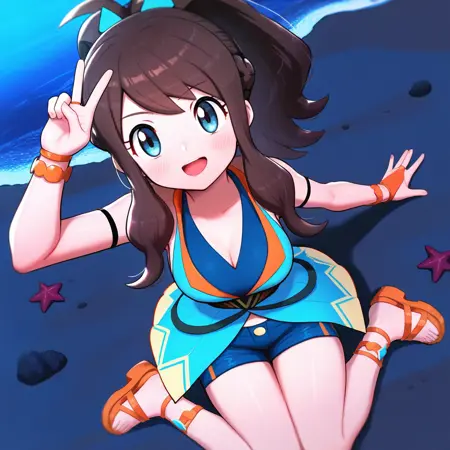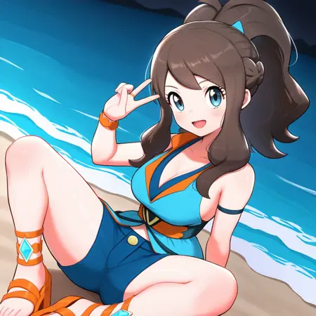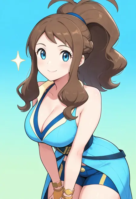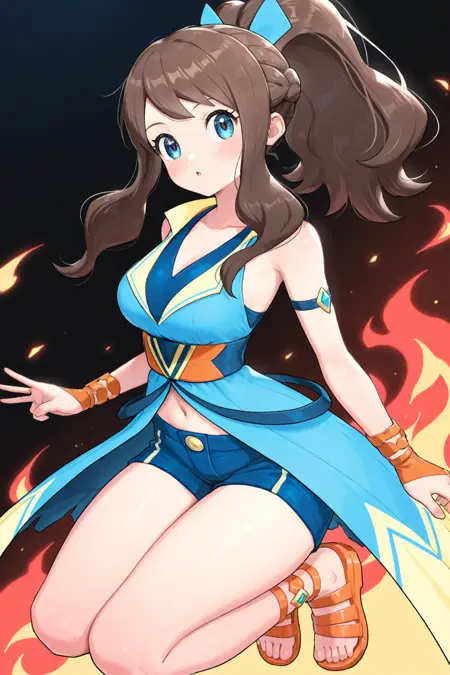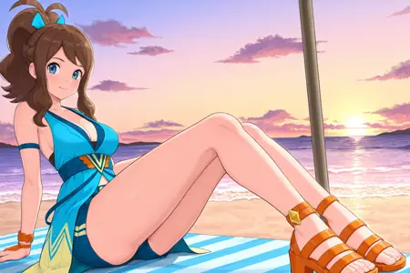 syghilda, blue eyes, brown hair, sidelocks, high ponytail, antenna hair, sleeveless dress, showgirl skirt, multicolored dress, beige dress, blue dress, v-neck, bridal gauntlets, bracelet, blue shorts, short shorts, sandals, orange footwear