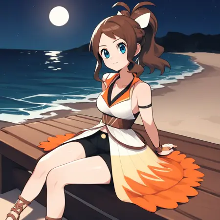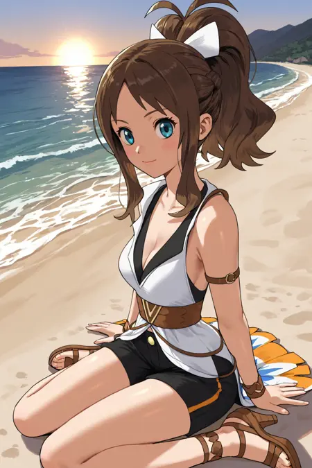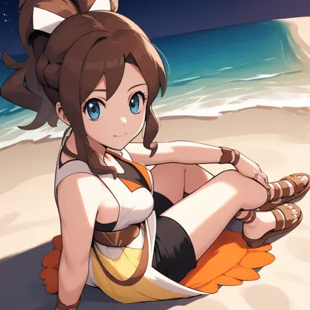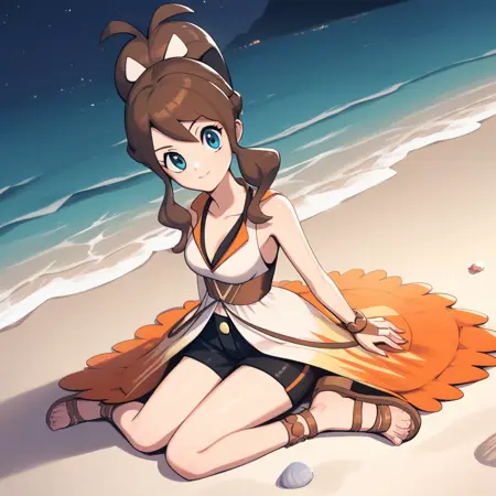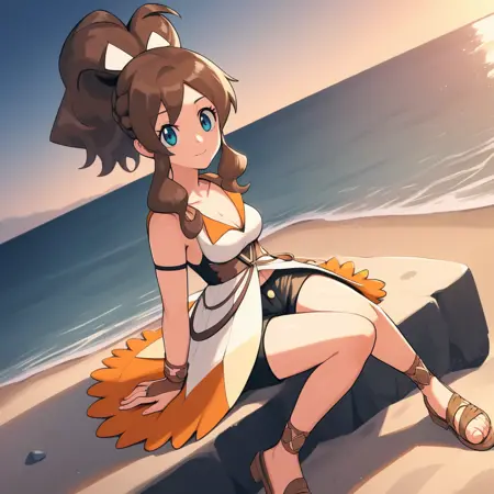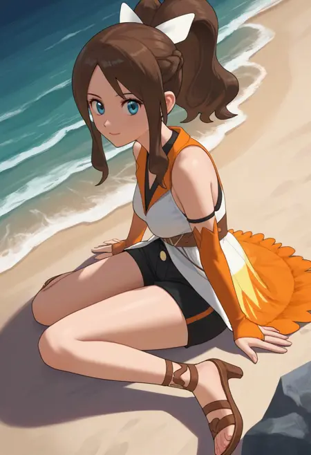 | Trained Words | syghilda, blue eyes, brown hair, sidelocks, high ponytail, antenna hair, sleeveless dress, showgirl skirt, multicolored dress, white dress, orange dress, v-neck, bridal gauntlets, bracelet, black shorts, short shorts, sandals, brown footwearCopied! |