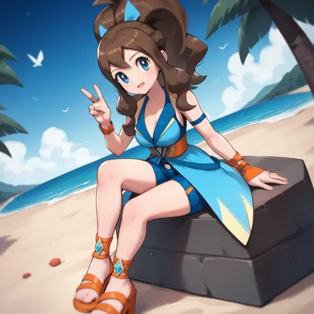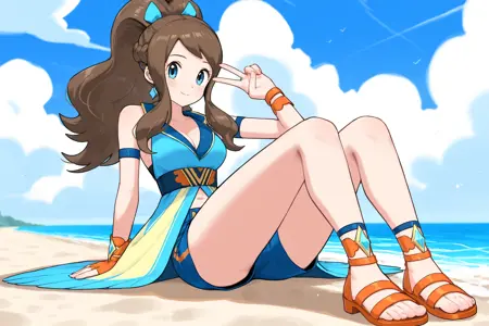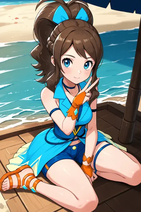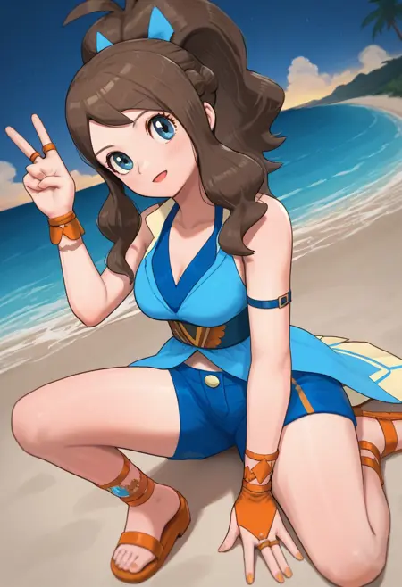 | Trained Words | syghilda, blue eyes, brown hair, sidelocks, high ponytail, antenna hair, sleeveless dress, showgirl skirt, multicolored dress, beige dress, blue dress, v-neck, bridal gauntlets, bracelet, blue shorts, short shorts, sandals, orange footwearCopied! |