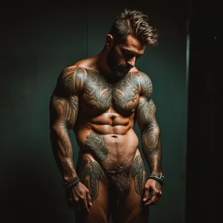 드라마틱한 조명과 저각에서 남성의 복근을 멋진 이미지로 생성합니다.