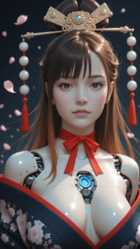 Lilij 的外貌体现了她的双重性。她身着点缀着樱花的和服,精密的机械核心透过人造皮肤微微发光,暗示其体内搭载的先进人工智能系统。在她胸口正中央,是心之透镜——一个发光的开口,能够捕捉与她互动之人记忆、情感与数据。这装置赋予她理解他人言语背后情感的能力。