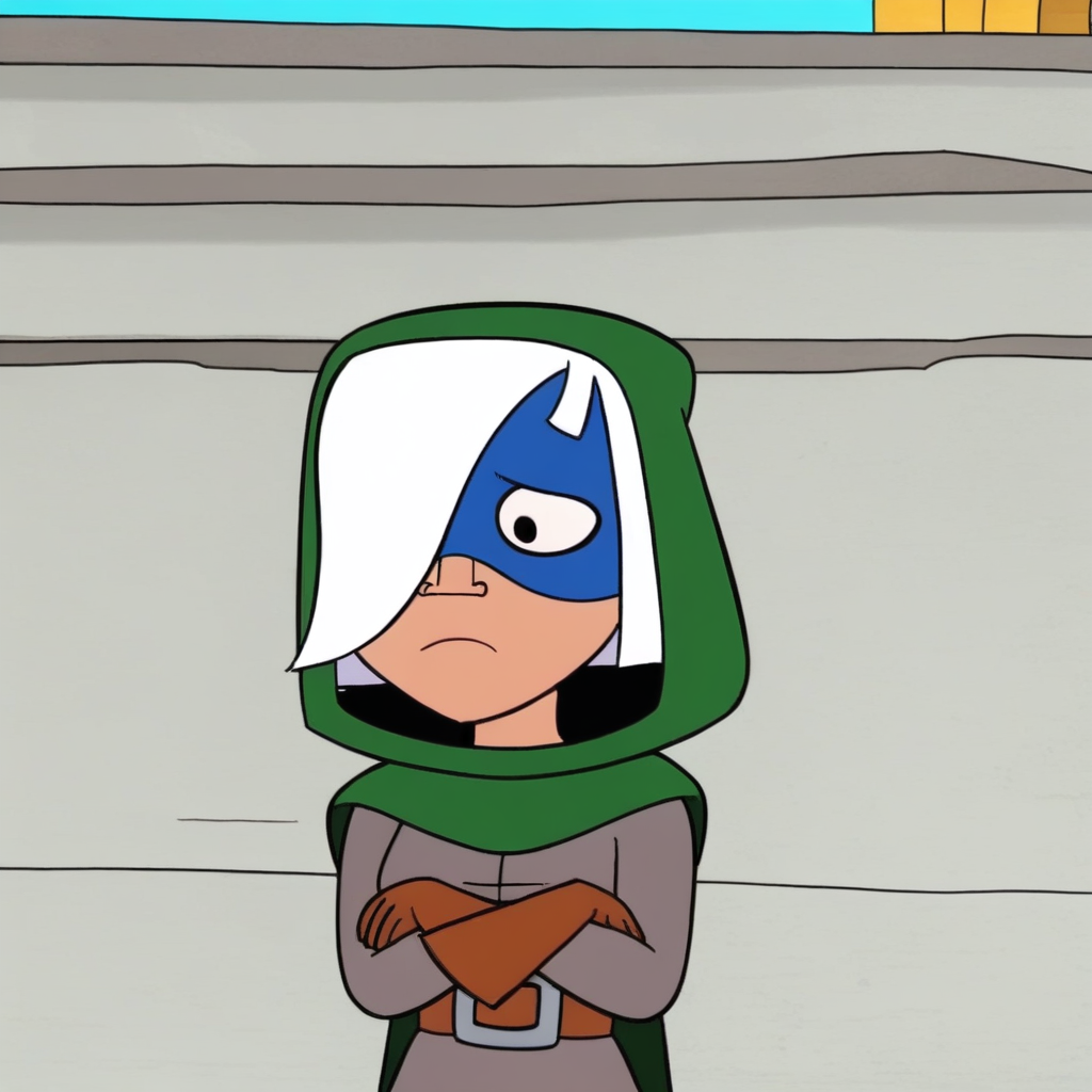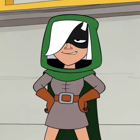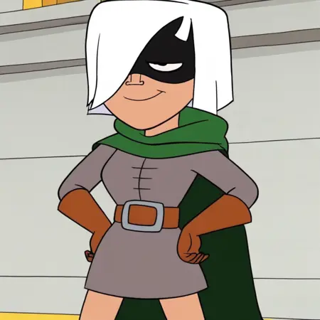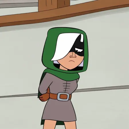 Clash-a-rama, bandit, 1girl, solo, black eyes, gray dress, dark green cape, dark green hood, black mask, brown gloves, belt, white hair, hair over one eye, short hair, light-skinned,