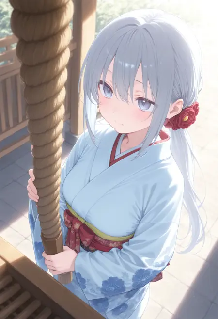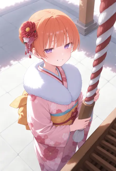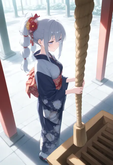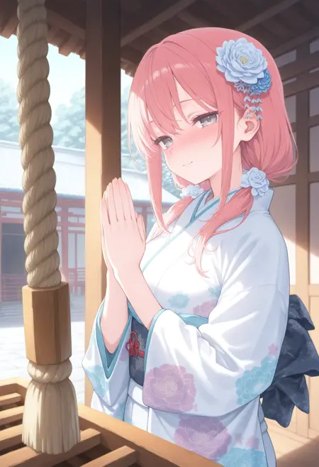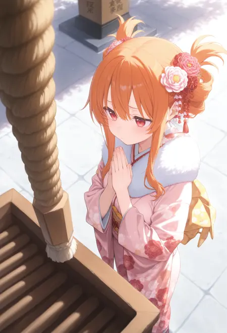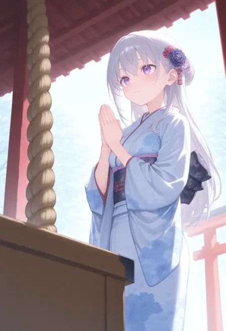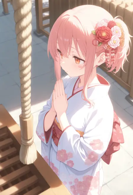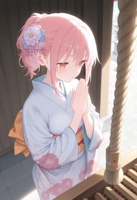 “shrine”에 반응하여 복장을 지정하지 않으면 미코리복을 입히기 쉬우므로 복장을 지정하는 것이 좋습니다. 안정성을 높이려면 rope, outdoors, standing, new year, shimenawa, hatsumoude, donation box 중 하나를 선택하고 종을 울리려면 holding을, 기도시키려면 own hands together, praying, hands up, palms together를 추가하세요.