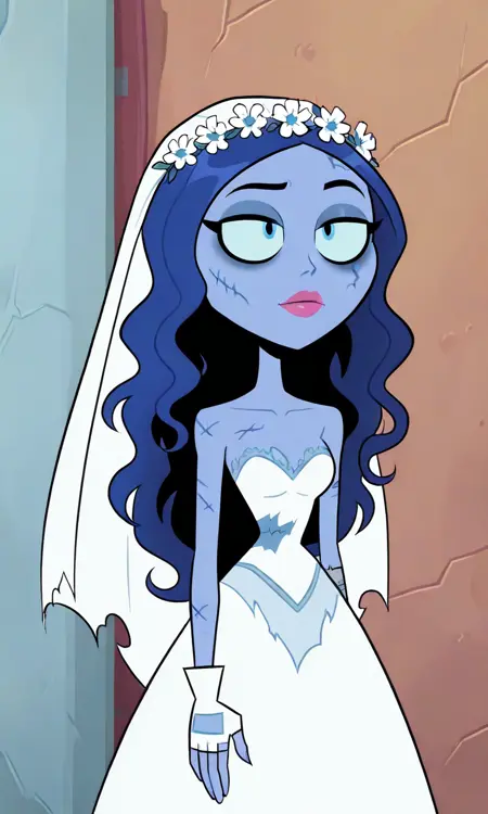 | 训练词汇 | 1girl,emily(corpse bride),zombie girl,colored skin(blue skin),scars,stitches,blue hair,wavy hair,long hair,blue eyes,pink lips,flower wreath,white veil,strapless dress,white dress,blue-trimmed dress,wedding dress,fingerless white gloves,torn clothes已复制! |