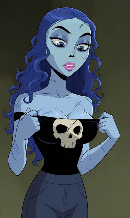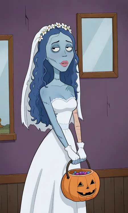 | 학습된 단어 | 1girl,emily(corpse bride),zombie girl,colored skin(blue skin),scars,stitches,blue hair,wavy hair,long hair,blue eyes,pink lips,flower wreath,white veil,strapless dress,white dress,blue-trimmed dress,wedding dress,fingerless white gloves,torn clothes복사됨! |